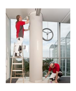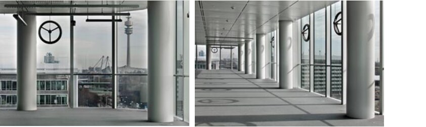 Die Maler lackierten zunächst eine Säule, die von den Auftraggebern als Muster für die Gesamtarbeiten freigegeben wurde. Sechs Mitarbeiter des Malerbetriebes gingen anschließend Stockwerk für Stockwerk ans Werk: Zuerst schliffen sie die alte matte Beschichtung mechanisch ab, anschließend trugen sie den neuen Lack einmal mit kurzflorigen Lackrollern auf. BMW als neuer Mieter folgte den Malern quasi auf dem Fuß in die neuen Räume: Die Mitarbeiter freuten sich insbesondere darüber, dass der Lack keine Gerüche hinterließ und sie ihre Arbeit sofort aufnehmen konnten. Bei der Endabnahme zeigten sich die Auftraggeber vom Ergebnis überzeugt.