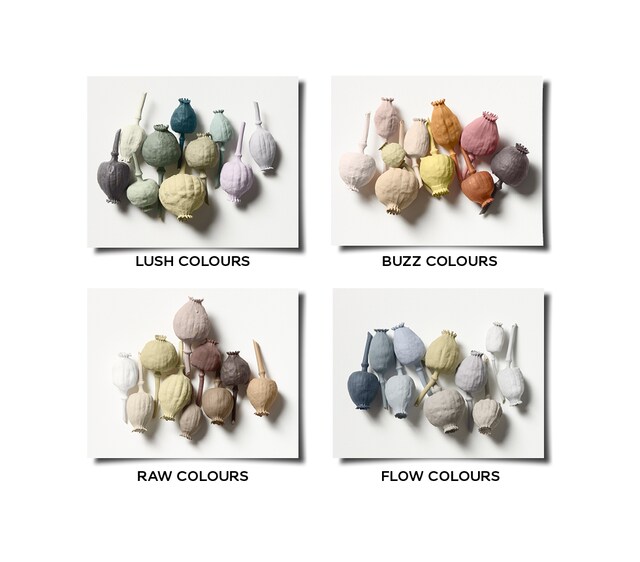 Inspiriert von der Farbigkeit der Wälder, Parkanlagen und Gärten erzeugen die üppigen Lush Colours ein vertrautes Ambiente. Die Farbtöne sind perfekt aufeinander abgestimmt und verleihen sogar dem heimischen Computerarbeitsplatz eine natürliche Ausstrahlung. Die fröhlichen Rosa- und Ockertöne der Buzz Colours feiern die Vielfalt einer Blumenwiese und erzeugen selbst in einem großen Raum eine vitale und vertraute Atmosphäre. Sie sind deshalb die perfekte Wahl für Räume, in denen man sich gern mit anderen trifft. Mit ihren erdigen Schattierungen legen die Raw Colours Zeugnis ab vom faszinierenden Reichtum der Natur und schaffen Räume voller Kreativität und Möglichkeiten. Angeregt vom Rhythmus der Natur und den Gezeiten des Meeres vermitteln die weichen, fließenden Flow Colours Räumen eine erfrischende und ruhige Stimmung, die sich ausgleichend auf unser geschäftiges Leben auswirkt.
