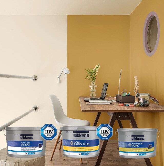 Die hochwertigen Alpha Innenwandfarben von Sikkens sind in vielen Tausend Wunschfarbtönen erhältlich. Sie überzeugen durch eine exzellente Farbbeständigkeit, hohe Deckkraft und strapazierfähige Oberflächen. Legt Euer Kunde Wert auf ein gutes Raumklima? Dann ist Alphasol Silikat bestens geeignet. Diese mineralische Farbe ist diffusionsoffen und feuchtigkeitsregulierend und trägt so zu einem angenehmen Raumklima bei. Soll es schnell gehen, hat Euer Kunde wenig Zeit? Alpha Rapid Plus lässt sich zügig und einfach streichen, verläuft prima – fast ganz ohne Spritzen – und deckt sehr gut, in der Regel schon beim ersten Anstrich. Müssen die Wände im Homeoffice absolut glatt und perfekt werden und der Farbton von höchster Intensität sein, wird die superfeine edelmatte Oberfläche von Alphacron Pure Eure Kunden begeistern. Sie ist zudem außergewöhnlich strapazierfähig, sodass sie selbst in Museen eingesetzt wird. Ideal für höchste Ansprüche!