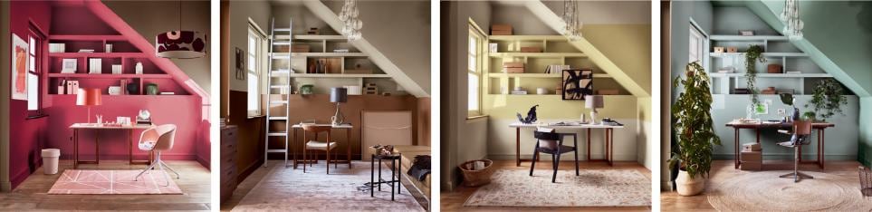 Mit Sikkens Farben und Lacken könnt Ihr einen Arbeitsplatz super vom Wohnbereich abgrenzen. Ein Homeoffice besteht meistens aus einem Schreibtisch mit Lampe und Laptop, einem Schreibtischstuhl und einem Regal oder Ablagetisch. Damit diese Möbel nicht wie Fremdkörper in einem Raum oder einfach nur lieblos „hingestellt“ wirken, brauchen sie einen Rahmen. Den erreicht man am besten mit Farbe. Vorher – nachher: Folgende Bilder zeigen Euch einige innovative Homeoffice-Lösungen, die mit Farbtönen aus den vier aktuellen Trendpaletten realisiert wurden. Sie machen sichtbar, wie Farbe einen Arbeitsbereich im Raum definieren oder wie durch kreative Farbeffekte eine stimulierende Arbeitsatmosphäre geschaffen werden kann.