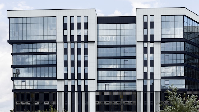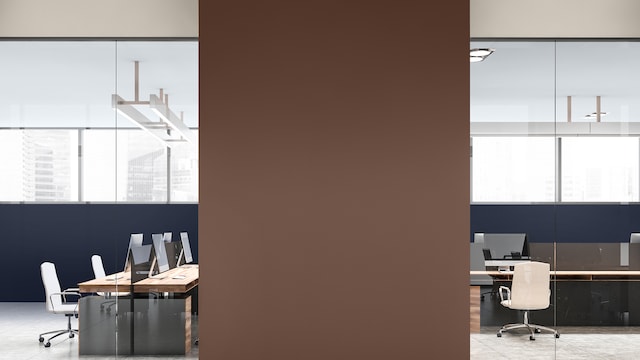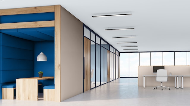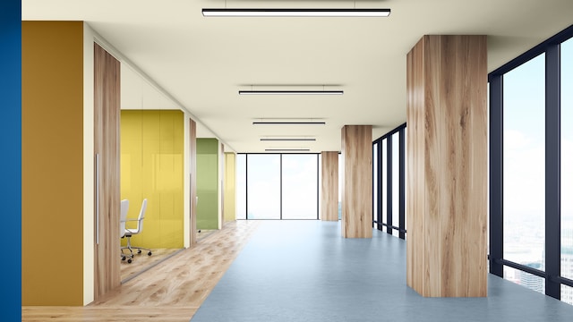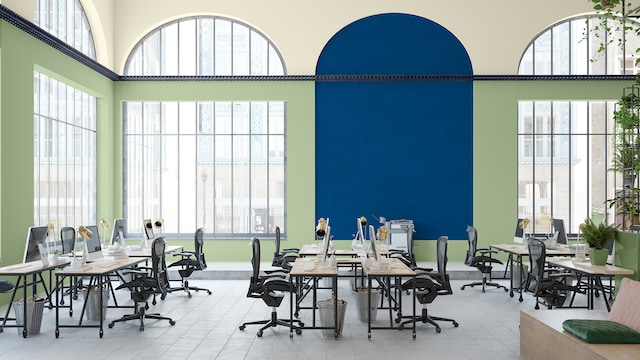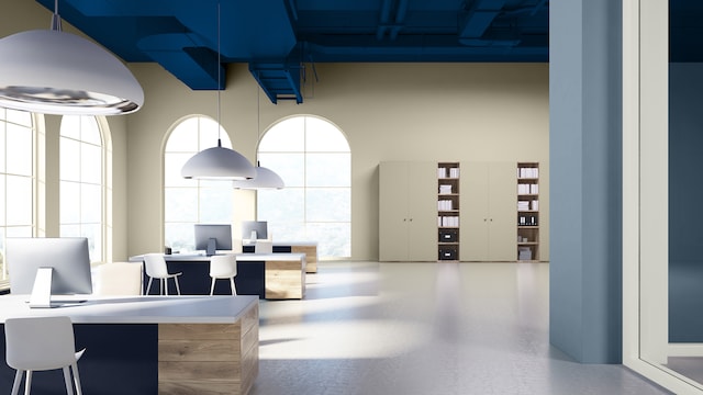 Großraumbüro mit blauer Decke und farblich neutralen Wänden