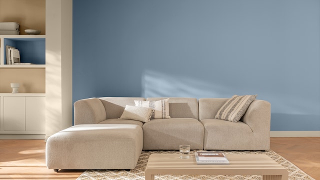 Wohnzimmer mit Wänden in drei verschiedenen Blautönen