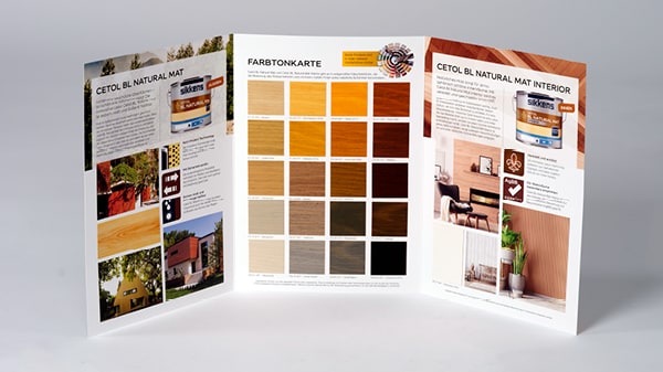 Die Farbtonkarte Cetol BL Natural Mat / Cetol BL Natural Mat Interior präsentiert die Schönheit von Holzoberflächen anhand von 20 ausgewählten Naturfarbtönen für den Außen- und Innenbereich. Für innen gibt es zusätzlich ein Opalweiß.
